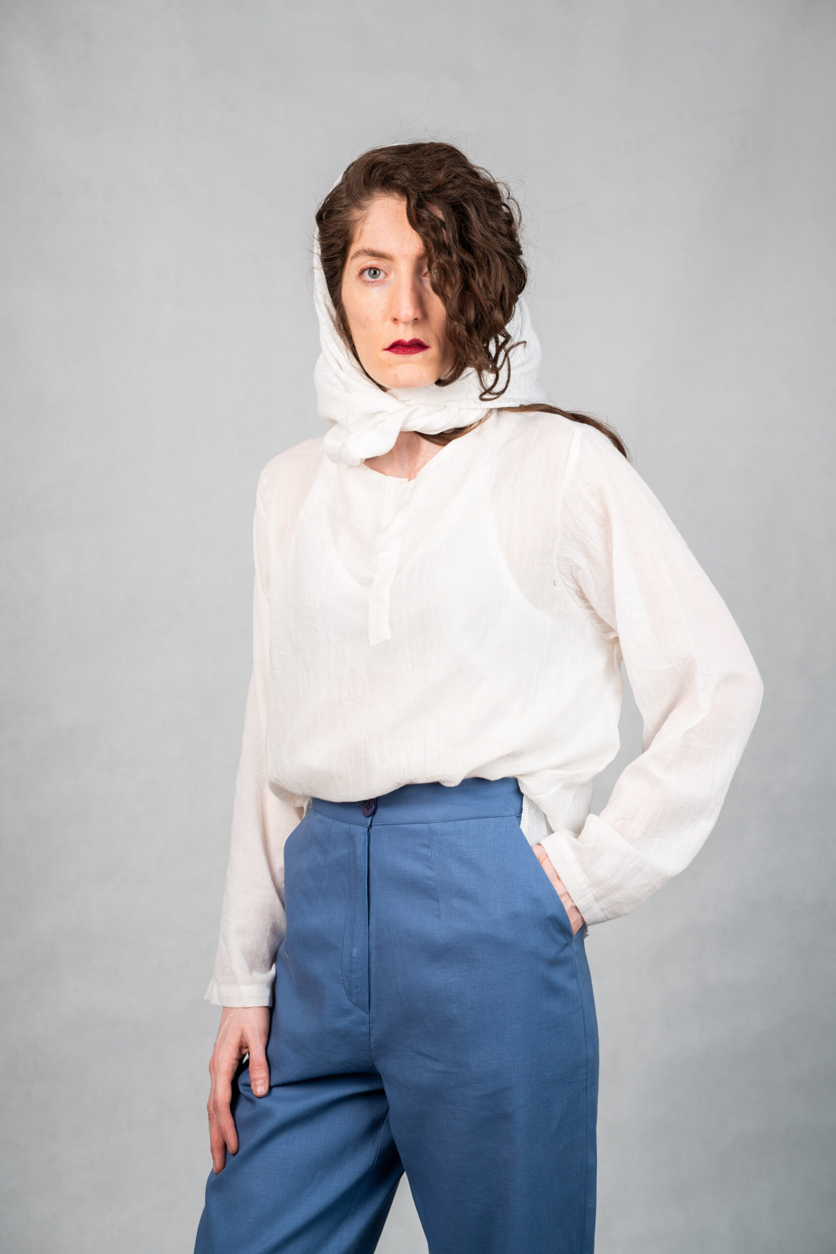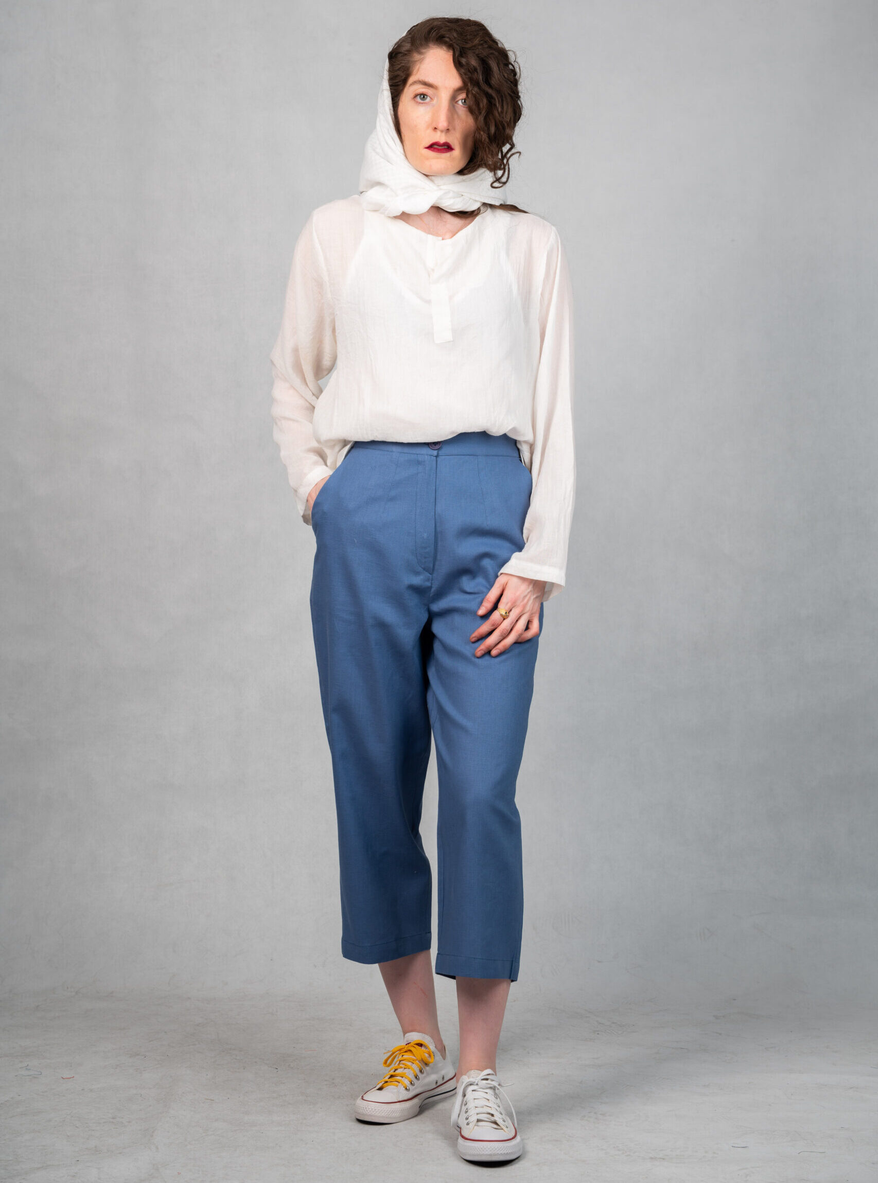 شلوار مینیستر از پارچهی لطیف لینن و در رنگ مشکی است. قد آن تا بالای قوزک پاست. برش شلوار در اطراف ران کمی گشاد است، به همین دلیل شلوار در تن کاملا راسته میایستد. شلوارهای راسته به اینکه بدن لاغر و کشیده دیده شوند کمک میکنند.