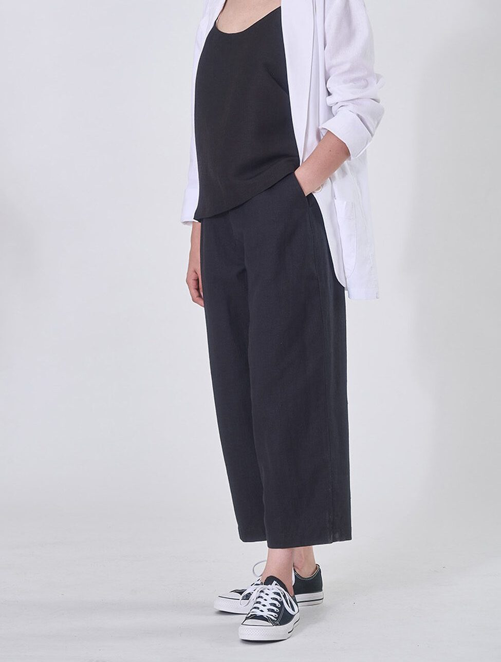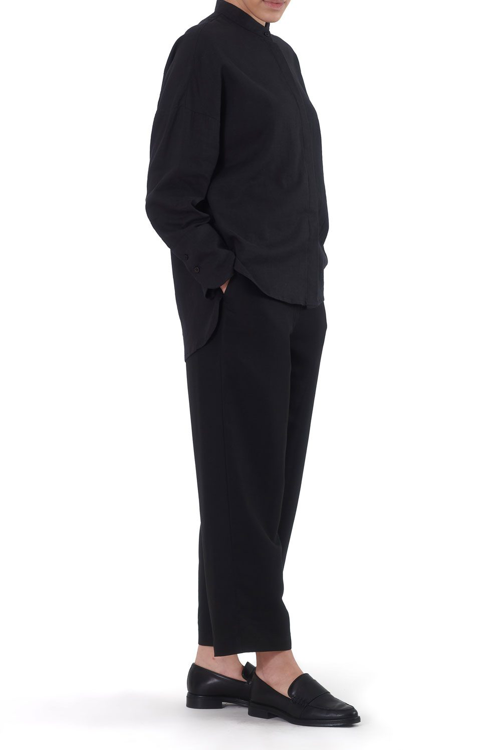 شلوار مینیستر از پارچهی لطیف لینن و در رنگ مشکی است. قد آن تا بالای قوزک پاست. برش شلوار در اطراف ران کمی گشاد است، به همین دلیل شلوار در تن کاملا راسته میایستد. شلوارهای راسته به اینکه بدن لاغر و کشیده دیده شوند کمک میکنند.