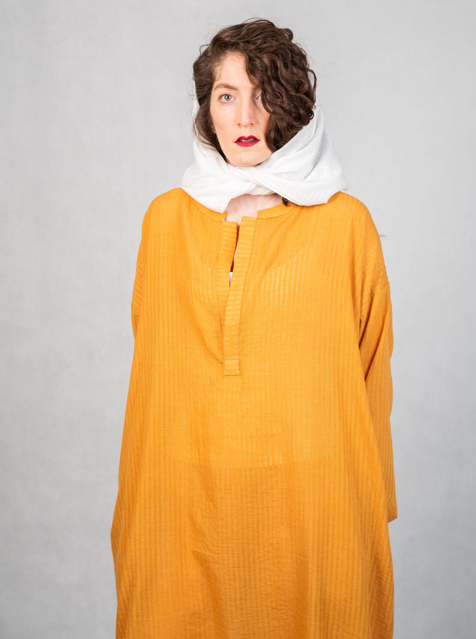 کفتان تابستانی بلند با یقه بدون دکمه و دو جیب که در دو طرف به اندازه 40 سانت چاک دارد.
